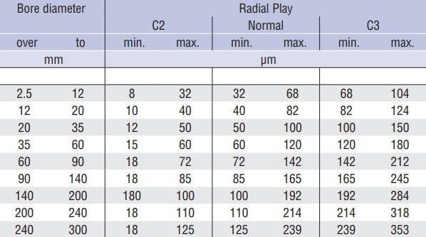 Spherical bearings are normally manufactured with a normal radial play, which is not designated. The values of radial clearances are given in the following table.
